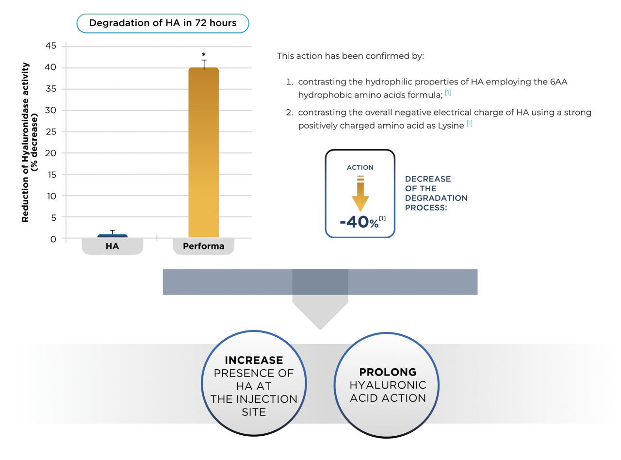 A study on Sunekos Performa demonstrated that the presence of its specific combination of AAs (HY6AA formula), with their ancillary action, decreases the degradation of HA by reducing the Hyaluronidase process, by reducing the Hyaluronidase process [1].