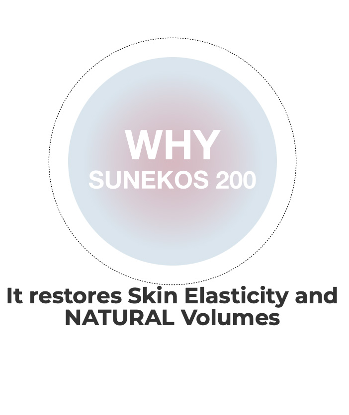 Sagging Skin and Severe Wrinkles are mainly caused by Loss of Volume. HA over 1 Mio Dalton protect fibroblasts and structural elements of the dermis, as a Free Radical “Scavenger”. It has antioxidant and “volumising” properties, boosting the consequent action of Sunekos 200.